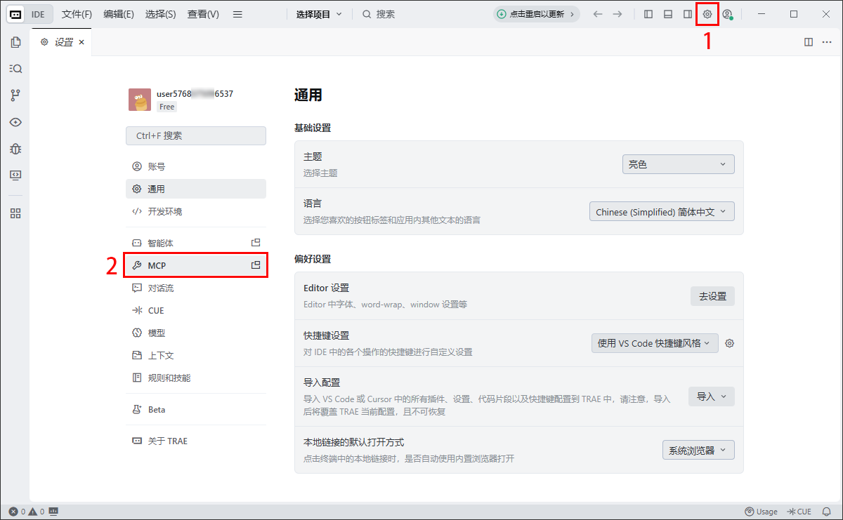 (2)复制含Token的MCP配置JSON后,打开AI编辑工具Trace,点击【设置】->【MCP】设置MCP Server。