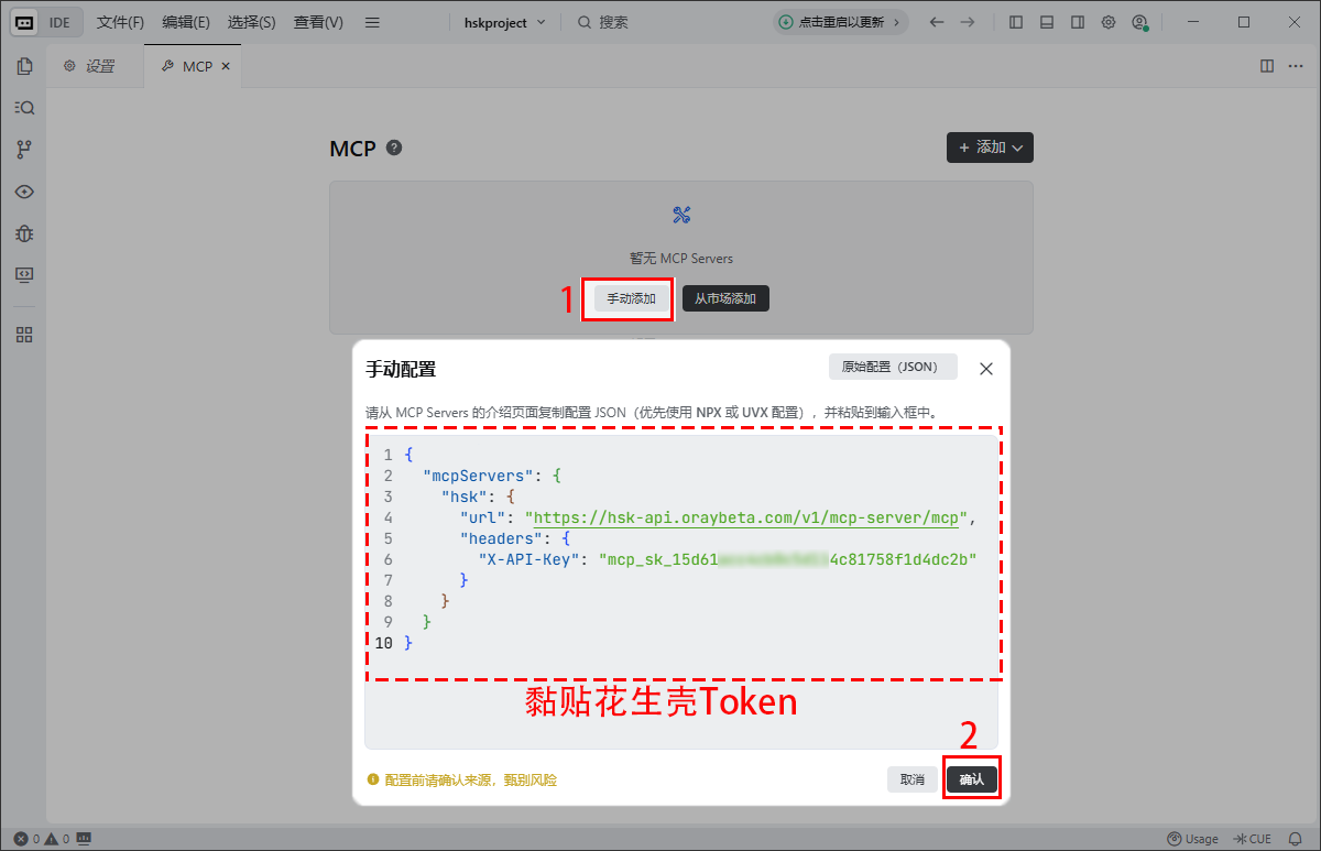 (3)在MCP Server界面点击【手动添加】,粘贴在花生壳管理平台复制的含花生壳Token的MCP配置JSON。