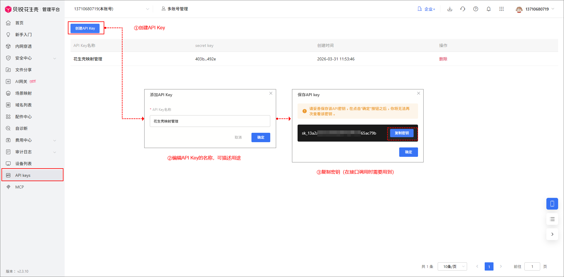 1.获取途径:登录 花生壳管理平台 ,进入 API keys 页面,创建一个新的 API Key 并获取密钥内容。