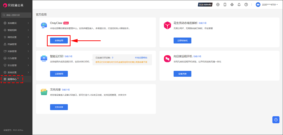 (3)【应用中心】->【OrayClaw】,点击【安装应用】后按照指引完成安装。