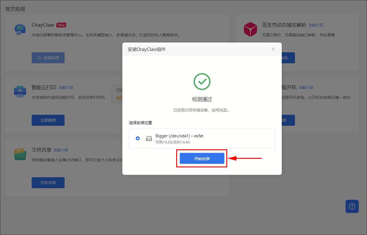 (4)确认安全风险后,点击“继续安装”,即可扫描发现U盘/硬盘,点击“开始安装”OrayClaw组件。