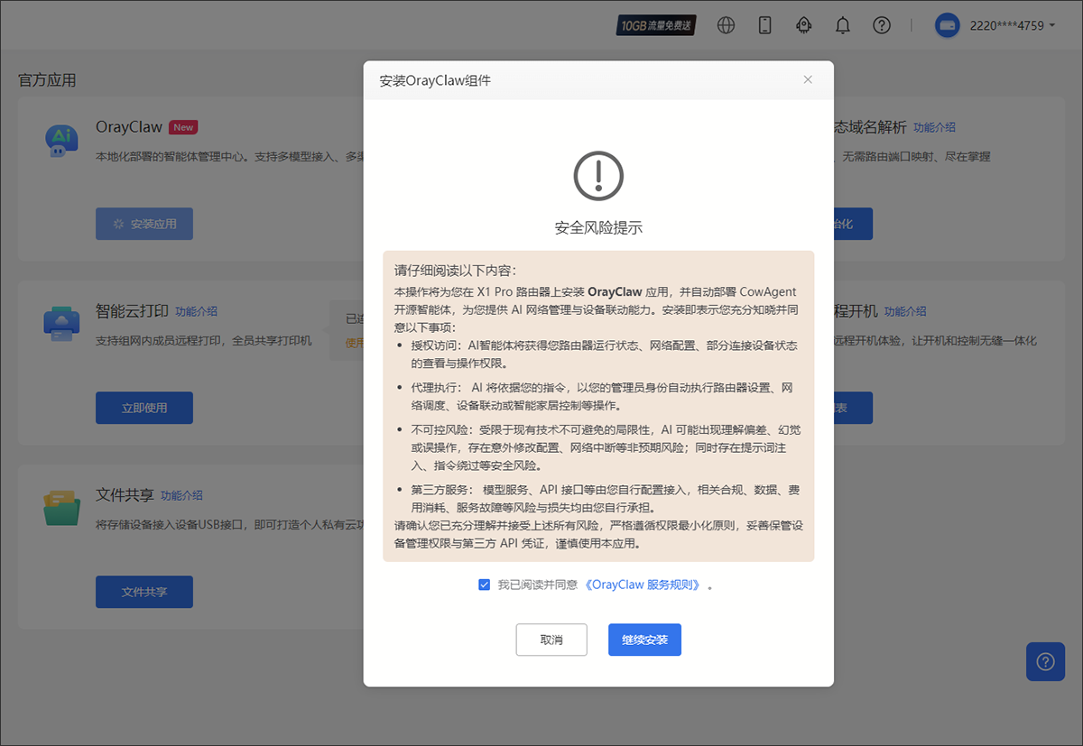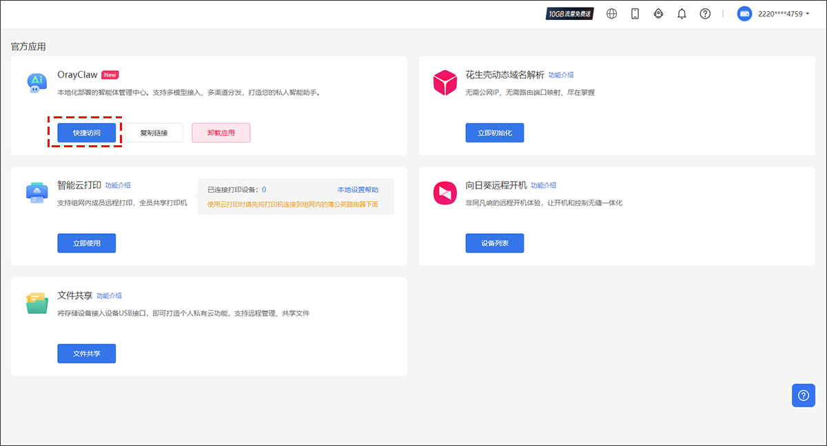 (5)组件安装完成,可点击“快速访问”进入OrayClaw的界面。访问OrayClaw可以通过 WiFi 或网线直连至X1 Pro进入管理页面,也可以通过与X1 Pro组网后快捷访问。