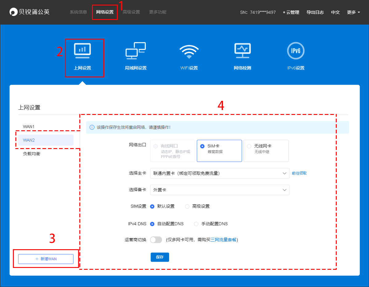 (2)在【网络设置】->【上网设置】->【新增WAN】,新增APN上网方式。