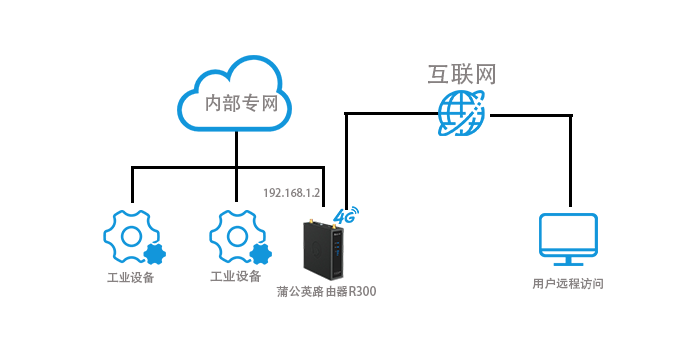 蒲公英是由贝锐自主研发的一款异地组网平台,能实现将异地网络组建成一个大的虚拟局域网。根据当前情景的网络环境,我们可为工业设备配置蒲公英的工业级·4G无线路由器R300系列,将R300路由器设置为旁路路由,即可完美满足异地访问没有互联网的工业设备的需求,下面请看详细步骤。