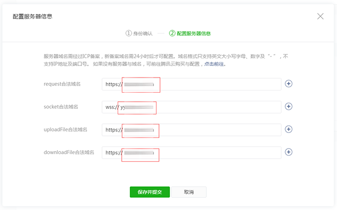 进入“服务器配置-开始配置”,填写服务器地址,此处统一填写**小程序服务器域名。** 最后点击“保存并提交”即可。