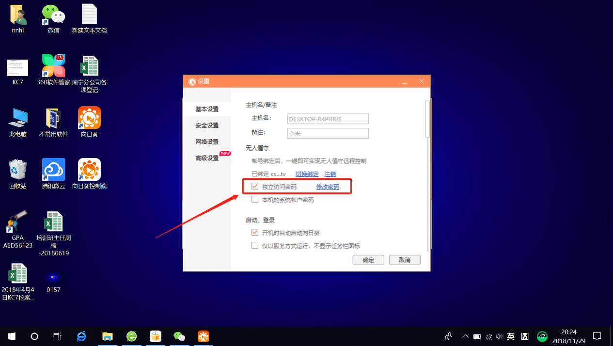 下面是步聚: 第一步,在办公室电脑下载安装向日葵客户端做为受控端,安装好后登录自己的向日葵账号,没有的注册一个,记得受控端和主控端都是登录同一账号;安装好后做好访问设置,因为远程访问需要密码,有系统账户密码和独立访问密码两种选择,我的客户端有几台,所以通常是设置独立密码,如下图。