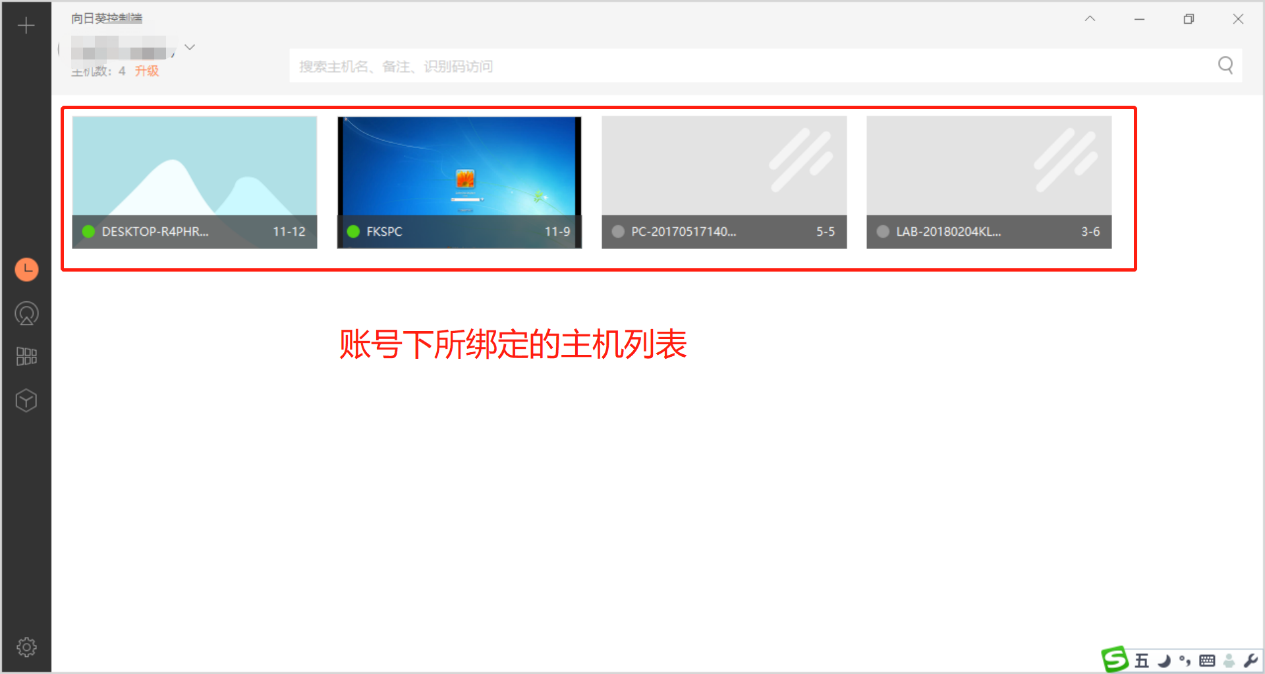 第二步,在家里或随身电脑安装向日葵远程控制端(主控端),安装好后登录与受控端相同的账号和密码,登录后即可看到所有在线的远程客户端,我们称之为主机。