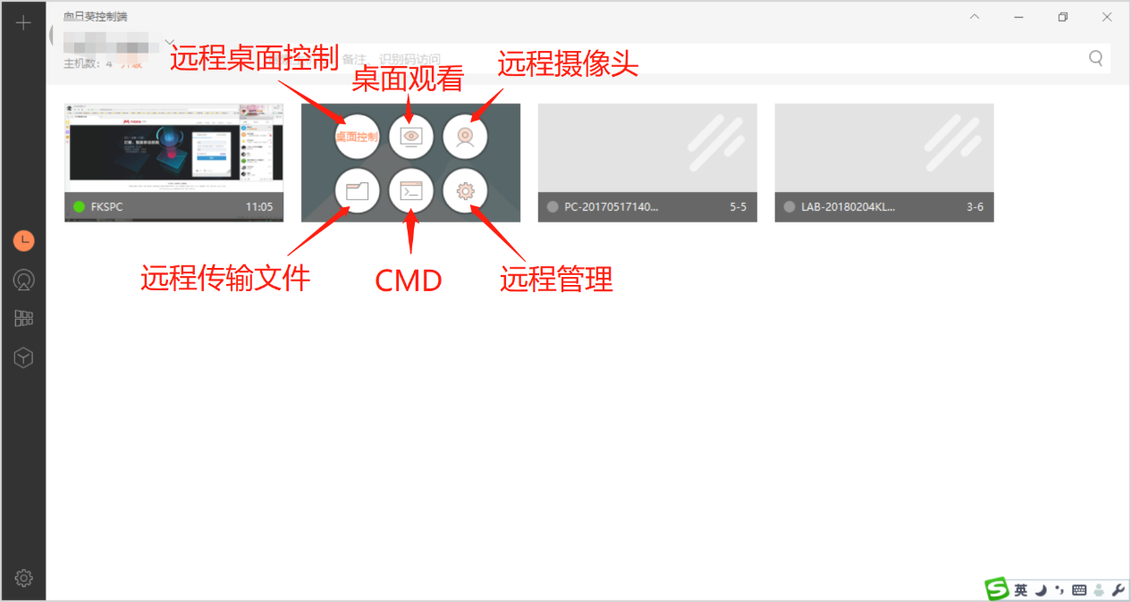 将鼠标移到主机上会显示相关的远程功能,远程控制是最常用的,桌面观看适合办公桌面管理查看,远程传输文件也非常方便,远程摄像头还可以用来看家,CMD是技术型管理常用,还有远程管理。不过除了远程桌面控制和桌面观看是免费的,其他功能都要升级会员账号才能使用。