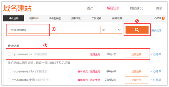 2.查询结果若显示可以注册,点击“立即注册域名”进入域名注册页面。若不能注册则重新选择域名。